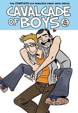 Imagine a (gay) comics fan-boy like me who hasn’t read one whit a single gay genre comic book? Say it ain’t so! Well, I’ve now officially purchased and completed Fish’s hefty collection of his long-running Cavalcade of Boys, and loved every single adorably trashy moment. (Oh, and let’s set the record straight – so to speak – on the gay comics front: These things are hard to come by domestically; with the exception of the two-boys-in-love manga subgenre that is specifically written for the teenage girl crowd over in the land of the rising sun.)