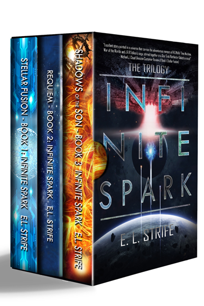 This trilogy includes the first three books of the Infinite Spark series. Book1: STELLAR FUSION — “We give our blood to nourish the soil that feeds them, and then we are nothing, discarded, sent to the stars and—forgotten.” Sergeant Nakio Atana is the Universal Protectors’ elite assassin and holds within a spark of unimaginable power. A daring escape from an enemy ship knocked the first fifteen years of her life into darkness, leaving her with only inexplicable apathy and technical knowledge beyond Earth’s evolution. What she is can change their future. Sergeant Bennett must guard her with his life.