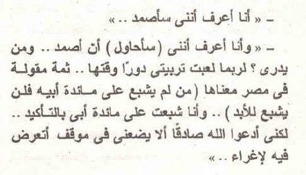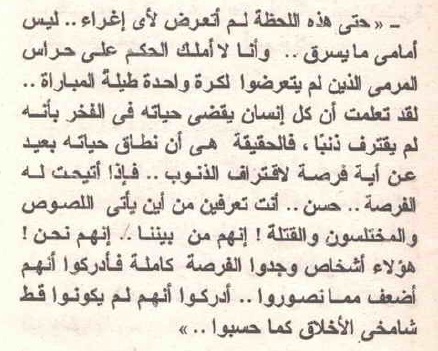 " لقد تعلمت أنّ كل إنسان يقضى حياته فى الفخر بأنه لم يقترف ذنباً , فالحقيقة هى ان نطاق حياته بعيد عن أية فرصة لإقتراف الذنوب.. فإذا أُتيحت له الفرصة.. حسن.. أنت تعرفين من أين يأتى اللصوص والمختلسون والقتلة.. إنهم من بيننا.. إنهم نحن ! هؤلاء أشخاص وجدوا الفرصة كاملة فأدركوا أنهم أضعف مما تصوروا.. أدركوا أنهم لم يكونوا قط شامخى الأخلاق كما حسبوا.."