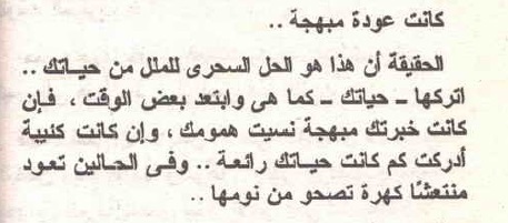 •الحقيقة ان هذا هو الحل السحري للملل من حياتك..اتركها-حياتك-كما هي وابتعد بعض الوقت ، فإن كانت خبرتك مبهجة نسيت همومك،وإن كانت كئيبة أدركت كم كانت حياتك رائعة .. وفي الحالين تعود منتعشًا كهرة تصحو من نومها..