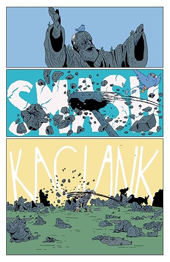 Bold colors, sweeping landsapes, lovely typography especially the sound effects, and great art by Crom can be found inside this volume. Birdking is about this teenage blacksmith apprentice girl named Bianca who wanders about this dangerous land and is kept in the dark about the world at large. We slowly learn there is magic, lore, old gods hidden in the pages of the book, but this is given to use in pieces.