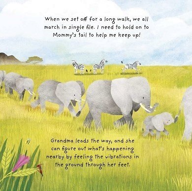 As Grandma leads them on a long walk, Little Elephant keeps up by holding her mother’s tail. “Grandma leads the way, and she can figure out what’s happening nearby by feeling the vibrations in the ground through her feet.”
