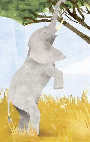On their way again, they see a male elephant who is on his own, because all male elephants leave the herd when they’re teenagers. This one is reaching high into a tree. “Some elephants have learned to stand on their back legs to reach the very highest leaves.”