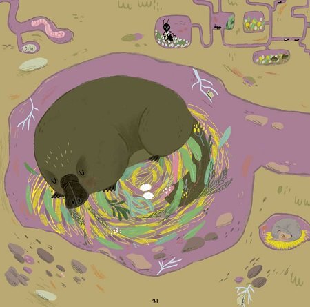 On to the nest and eggs. I loved the picture of the burrow with all the neighbours in their own homes. “We platypuses are mammals, but the females actually lay small, leathery eggs like reptiles!”