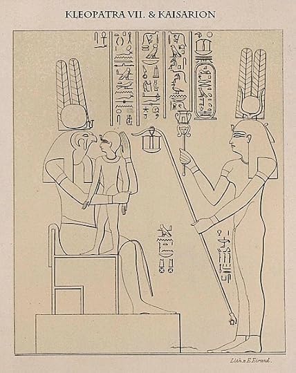 Cleopatra introduces her son Caesarion to the Egyptian falcon-headed god of war Montu. Image sourced from Wikimedia Commons.
