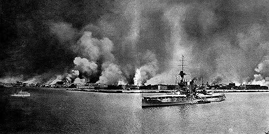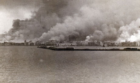 Този мултиетнически, шарен и процъфтяващ анклав загива в пламъците на буретата с петрол, разхвърляни от войските на Мустафа Кемал в християнските квартали, и подпалени. Десетки хиляди изгарят живи, стотици хиляди се втурват към пристанището, където турските войски грабят, изнасилват и колят под безпристрастните погледи на близо 20 чуждестранни военни кораба - английски, френски, италиански, американски. От корабите изблъскват в морето дори малцината достигнали ги с плуване. А камери и прожектори безучастно осветяват писъците и дима, който е толкова гъст, че го виждат дори в Истанбул.