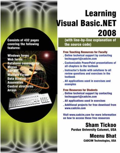 Learning Visual Basic.NET 2008 is an application-based textbook with line-by-line explanation of the source code, written to cater to the needs of the users who are learning VB.NET for the first time as well as the programmers who want to develop applications using Visual Basic 2008. In this textbook, the latest concepts of Visual Basic 2008 (with .NET Framework 3.5) have been explained in a simple and lucid manner. The chapters in the textbooks are structured in a pedagogical sequence, covering the basic as well as advanced concepts of Visual Basic.NET 2008 such as variables, operators, control structures, arrays, subprocedures, functions, and web forms to name only a few. All concepts have been explained with the help of suitable applications to ensure that the users can use them with ease while writing their own applications. Salient Features of the Textbook