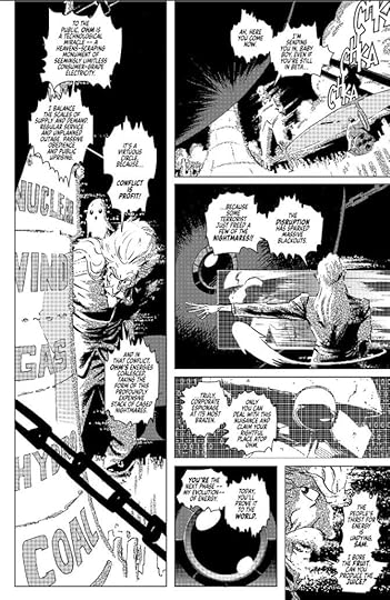 The story has too much plot happening in such a small page count to have any time left for exposition or plot stuff, and what little it can get across, it definitely won't have the time to let the reader chew on it in peace. We're already rushing onward to the next big thing, and the stakes are always high and the moments of relaxation all too few and far between. And what there is to be pieced together is not, in the end, all that interesting or compelling: social commentary, energy crisis, mad science. Bio-robots punching the shit out of each other. Prose isn't too good.