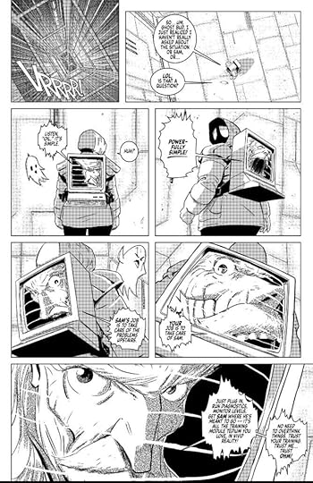 Ghost Cage tells the story, of a huge corporation, that is now being attacked by terroists. The head of this company, creates this weird A.I. thing named Sam to go in and stop the chaos going on in the big OHM factory. But Sam needs help, so a employee just trying to "climb the latter" is tasked to go with Sam and make sure he gets all of his needs. They go up the huge factory fighting monsters on each floor. Of course there's plot twists along the way, but that's the gist. I think this book is supposed to be this fast-paced adventure, that your supposed to read in one sitting. I didn't do that. So to me it just felt like a mess. You had zero time to breathe. It quickly went from one plot point to the next. To the point where I had trouble figuring out what was going on. Probably the only reason for reading this is the art. I loved how all the action and monsters were portrayed. It really made it feel like a manga. I wish it was in color, but for what it is, the art is pretty great. Not recommended