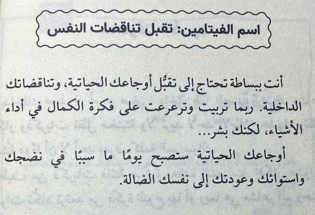 ٣٠ مقال و كل مقال بيتكلم عن مواقف من الحياة بنعيشها وبعدين بتعرفنا الكاتبة على كبسولة الفيتامين او الإرشاد النفسي اللي محتاجين للتعامل او التعايش مع الموقف... و في الاخر اسئلة مرتبطة بالموضوع.. كتاب خفيف و لطيف .. حبيته و حبيت اسلوب الكاتبة المريح ..و حبيته لغته السهلة و كلامه اللي بيعبر عن اللي جوانا ببساطة بدون تعقيد