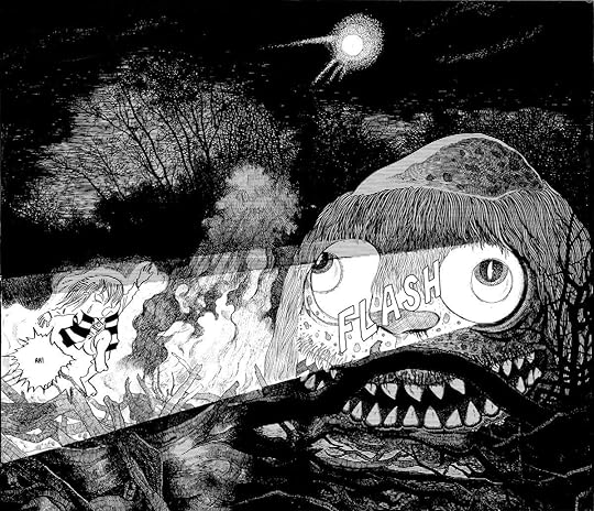 First time I've read any Mizuki, but I want to read more. The best parts of this are the yokai themselves, Mizuki giving them much more detail (drawn and not) than Kitaro or his pops. A glossary in the back gives detail to each one, not that you really need it, but especially great are Hyakume, a baseball playing oversized amalgam of curvy flesh, eyes and mouths; Kyuketsu-ki, a Kubrickian metaphysical night-sky dweller and nebulous god of one of the best stories, "Vampire Trees"; and of course the Zeuglodon, centerpiece from "Creature from the Deep," this collection's best (and longest) story, full of mad scientists, kaiju and battling robots. This is fun campy horror and I see why so many people like it. Strange that D&Q left unnoticed so many typos. Hopefully you'll correct those and re-release this one when volume 2 comes out... Right?