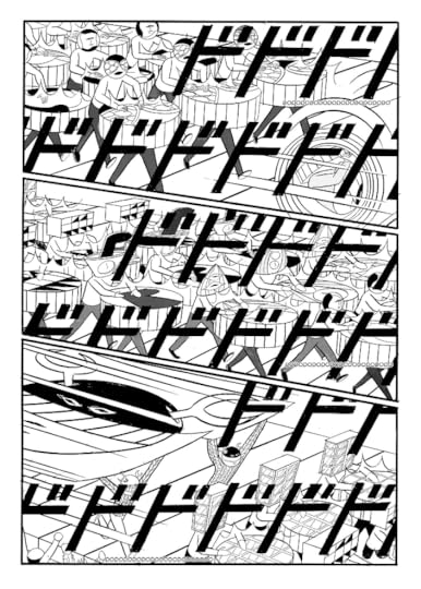 The panels are so dense they are difficult to understand. I myself had to limit my viewing of it to 25 pages at most a night. And I'm sure I missed things. In my mind I had to catalog all that was happening. For example, on page 24, I'd say to myself: ok, in the first panel, the "7" observation tower's floor has collapsed, spilling the two figures inside on to the stage. The "8" block following it has two pairs of octopus legs, totaling sixteen legs. The number "8" is shown three times, once on its side, and twice on its front. The audience is raising its hands--wait, actually, a giant ball has also dropped out of the collapsing "7" tower and bounced out onto the crowd. That looks to make a GORO noise, while the collapsing floor made a ZDOOF noise. Ok, on to the next panel. (2 seconds perhaps). Ah, I see, the "8" block actually has 8 *four* times on its side, now that it has come fully in to view: the 8 panels have dropped to reveal behind each what looks likea face per panel with a pipe as their nose, with no mouth. The panel-dropping has made a KCHUK noise. This is all that happens here. Next panel. (again, 2 seconds?) The pipe noses of each of these faces has protruded longer, to make them look like cannons, with a GWEEEEEN noise. Out of their eye holes now tiny cones have emerged. On to the next page.