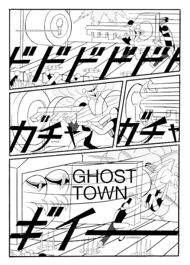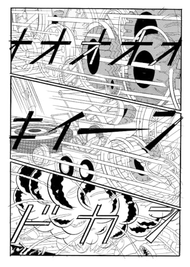 Making the busy, chaotic action on the conveyor belt visually denser are lines indicating movement (horizontal, vertical, and spin) and overlain characters indicating onomatopoeia that take up about a third of each panel. In short, Yuichi turns manga into abstract art. Readers who like conventional manga will probably avoid this book. Readers, like me, who are indifferent to manga are likelier to enjoy the chaos.
