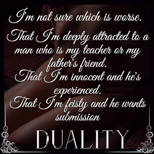 Duality is a story that has everything I love in a taboo romance. It has age gap, teacher-student, BDSM, bullying and a secret society and I just couldn't put it down.