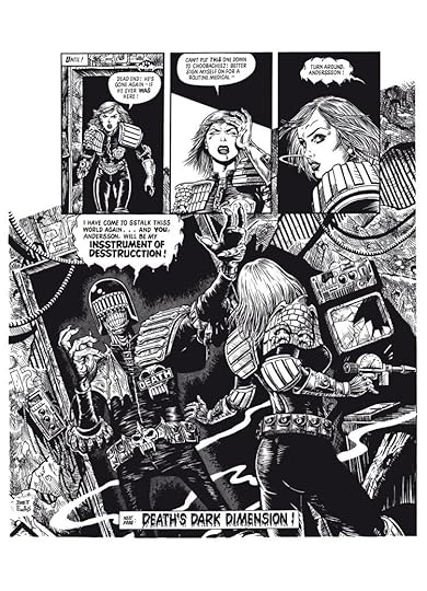 As in other Judge Dredd-related stories, there are moments of dark humor, such as when the Dark Judges attack the Ronald Reagan Block for the Aged. “Dodder for it!” And despite having unleashed horror on the city, Judge Anderson is restored to duty without penalty.