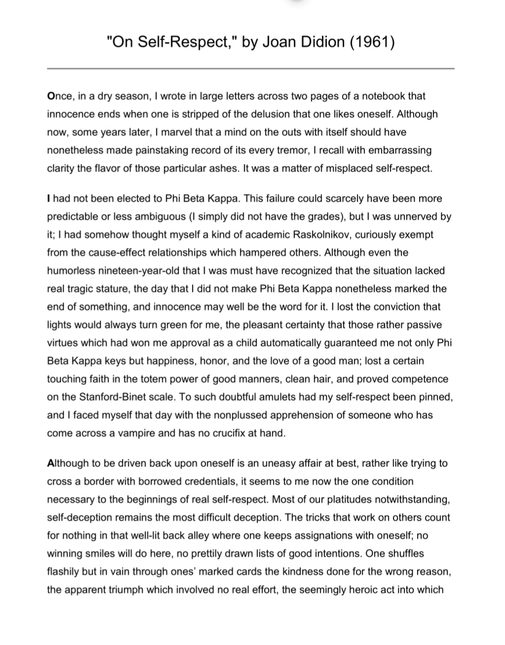 “It is the phenomenon sometimes called alienation from self. In its advanced stages, we no longer answer the telephone, because someone might want something; that we could say no without drowning in self-reproach is an idea alien to this game. Every encounter demands too much, tears the nerves, drains the will, and the specter of something as small as an unanswered letter arouses such disproportionate guilt that answering it becomes out of the question. To assign unanswered letters their proper weight, to free us from the expectations of others, to give us back to ourselves – there lies the great, the singular power of self-respect. Without it, one eventually discovers the final turn of the screw: one runs away to find oneself, and finds no one at home.”