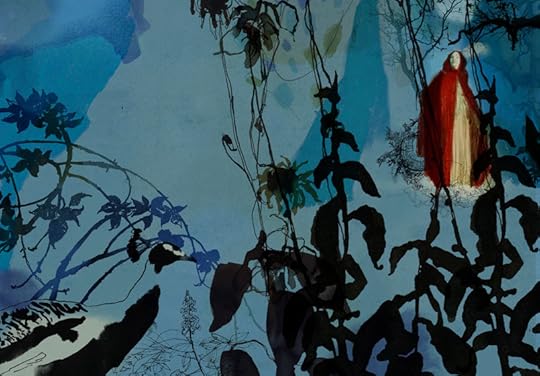Beautiful watercolors and fine line drawings interspersed with many fonts in various hues both bold and fancy daw you into this story. Some pages are almost angelic, some terrifying and gothic. Splotchy, dripping, brush strokes, combined with painstaking hairline thin ink drawings, that really need to be seen to be appreciated. There are amazing flowers blooming on the pages next to a frightening wolf whose whiskers are only in outline so they appear translucent. Some solids are in negative white some in solid black, even a feather floating down looks really real. The story stays true to the Brothers Grimm, and the wolf " gets it" in the end, from the handsome huntsman, so it really is a treasure. Daniel Egneus has a style unlike any other, eye-candy de-LUXE!