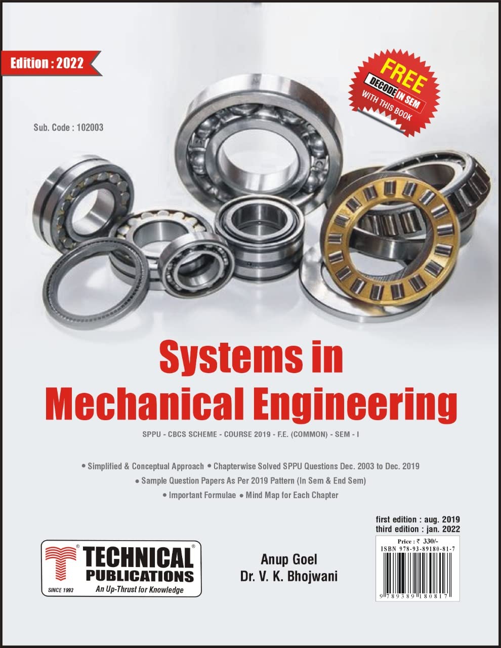 Unit I Introduction of energy sources & its conversion Energy sources : Thermal energy, Hydropower energy, Nuclear energy, Solar energy, Geothermal energy, Wind energy, Hydrogen energy, Biomass energy and Tidal energy. Grades of energy. (Numerical on efficiency calculation of thermal power plant ) Energy conversion devices : Introduction of pump, compressor, turbines, wind mills etc (Simple numerical on power and efficiency calculations) (Chapters - 1, 2) Unit II Introduction to Thermal Engineering Laws of thermodynamics, heat engine, heat pump, refrigerator (simple numerical) Modes of heat transfer : conduction, convection and radiation, Fourier’s law, Newton’s law of cooling, Stefan Boltzmann’s law. (Simple numerical) Two stroke and Four stroke engines (Petrol, Diesel and CNG engines). Steam generators. (Chapters - 3, 4) Unit III Vehicles and their Specifications Classification of automobile. Vehicle specifications of two/three wheeler, light motor vehicles, trucks, buses and multi-axle vehicles. Engine components (Introduction). Study of engine specifications, comparison of specifications of vehicles. Introduction of electric and hybrid vehicles. cost analysis of the vehicle. (Chapter - 5) Unit IV Vehicle Systems Introduction of chassis layouts, steering system, suspension system, braking system, cooling system and fuel injection system and fuel supply system. Study of electric and hybrid vehicle systems. Study of power transmission system, clutch, gear box (Simple Numerical), propeller shaft, universal joint, differential gearbox and axles. Vehicle active and passive safety seat, seat belts, airbags and antilock brake system. (Chapter - 6) Unit V Introduction to Manufacturing Conventional Manufacturing Processes : Casting, Forging, Metal forming (Drawing, Extrusion, etc.), Sheet metal working, Metal joining, etc. Metal cutting processes and machining operations- Turning, Milling and Drilling, etc. Micromachining. Additive manufacturing and 3D Printing. Reconfigurable manufacturing system and IOT, Basic CNC Concept of Computer Numerical Controlled machines. (Chapter - 7) Unit VI Engineering Mechanisms and their Application in Domestic Appliances Introduction to Basic mechanisms and equipment : Pumps, blowers, compressors, springs, gears, Belt-Pulley, Chain-Sprocket, valves, levers, etc. Introduction to terms : Specifications, Input, output, efficiency, etc. Applications of : Compressors - Refrigerator, Water cooler, Split AC unit; Pumps - Water pump for overhead tanks, Water filter/Purifier units; Blower - Vacuum cleaner, Kitchen Chimney; Motor - Fans, Exhaust fans, Washing machines; Springs - Door closure, door locks, etc.; Gears - Wall clocks, watches, Printers, etc.; Application of Belt-Pulley/Chain-Sprocket - Photocopier, bicycle, etc.; Valves - Water tap, etc.; Application of levers - Door latch, Brake pedals, etc.; Electric/Solar energy - Geyser, Water heater, Electric iron, etc. (Simple numerical on efficiency calculation) (Chapter - 8)