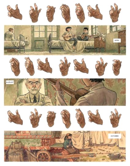 Bonita historia, una biografía que desconocía… Historias que te insuflan aire y fuerza. Sería un ejemplo a seguir en nuestro cómic ya que nos permitiría conocer a muchas personas desconocidas. Esta tradición educativa del cómic francés o belga ya lo tiene incorporado en su estilo narrativo. Todavía estoy aprendiendo a reconocer la arquitectura de cada página del cómic, a encontrar sus equilibrios de fuerzas entre las viñetas. El dibujante Ricard Efa consigue una magnífica textura de color con su original en acuarela, crea una atmósfera de color que te transporta al ritmo, sonoridad de la época del músico Django. Tampoco puedo olvidar comentar la excelencia de todos los detalles, cómo nos contextualiza esos momentos, esos lugares de la historia y, por supuesto, el detalle de las manos, de su lucha por volver a tocar…