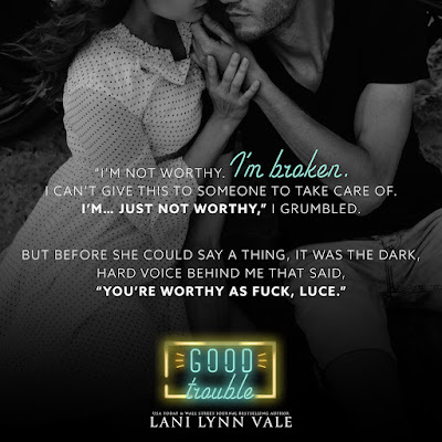 Good Trouble is the second book in the Gator Bait series by Lani Lynn Vale. We met Bain in Nobody Cares Unless You're Pretty and I loved his story! It's a very complicated one! He saved his brother's girlfriend and went to jail for it. Now he's out and back home and he never stopped caring for Diana, or Luce as he calls her. She married his brother, but they are divorced. Diana never forgot Bain or what he did to save her. Her ex is a total jackass and she's glad that's over. Now that Bain is back she can't stop thinking about him. And it's not helping that he seems to be everywhere she is. The pull is too strong to fight. Bain doesn’t care what his brother thinks. His parents love her already. Now he just has to convince Luce to take the chance. When she realizes that Bain is the balm to her soul. The happiness that helps her depression and the man who lights he body on fire, she's all in! Now they just have to deal with someone trying to kill her and him. But they are stronger together and they can get through anything. I loved Bain and Luce. He's so funny and sexy and loving. She's independent, smart and knows what she wants to do with her life. I loved his parents and how fierce they are! We get to see more of the other men and I'm excited for all their stories!