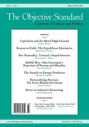 The Winter 2008 issue (Vol. 3, No. 4) features the following articles and Capitalism and the Moral High Ground, by Craig BiddleReason or The Republican Alternative, by John David LewisNet Toward a Stupid Internet, by Raymond C. NilesBubble Alan Greenspan’s Rejection of Reason and Morality, by Gud Van HornThe Assault on Energy Producers, by Brian P. SimpsonDemystifying The Force Behind the Genius, by Gena GorlinErrors in Inductive Reasoning, by David HarrimanNew Deal or Raw Deal? (Burton Folsom Jr.), reviewed by Eric DanielsBetter Day Coming (Adam Fairclough), reviewed by Gus Van HornThe Objective Standard is a quarterly journal of culture and politics written from an Objectivist perspective (Objectivism being Ayn Rand’s philosophy of reason, egoism, and laissez-faire capitalism). The journal is based on the idea that for every human concern—from personal matters to foreign policy, from the sciences to the arts, from education to legislation—there are demonstrably objective standards by reference to which we can assess what is true or false, good or bad, right or wrong. The purpose of the journal is to analyze and evaluate ideas, trends, events, and policies accordingly. We maintain that the standards of both knowledge and value derive from the facts of reality; that truth is discovered only by means of reason (i.e., through observation and logic); that the factual requirements of man’s life on earth determine his moral values; that the selfish pursuit of one’s own life-serving goals is virtuous; and that individual rights are moral principles defining the fundamental requirements of a civilized society. We stand opposed to the notion that the standards of knowledge and value are not factual but subjective (feeling-based) or other-worldly (faith-based); that truth is ultimately dictated by majority opinion or a “supernatural” being’s will; that democratic consensus or “God’s word” determines what is moral; that sacrifice for “the common good” or in obedience to “God’s commands” is virtuous; and that rights are social conventions or “divine decrees.” In stark contrast to these philosophic approaches, ours is a philosophy of reality, reason, egoism, and laissez-faire capitalism.