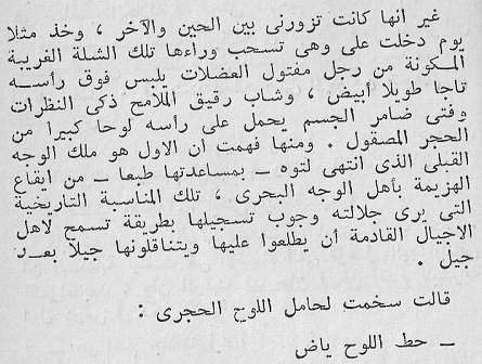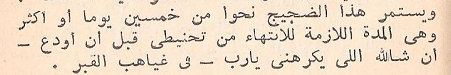 " عزيزى القارئ: يؤسفنى أن أخطرك بشئ قد يحزنك بعض الشيء وذلك بأننى قد توفيت، وأنا طبعا لا أكتب هذه الكلمة بعد الوفاة (دى صعبة شوية) وإنما اكتبها قبل ذلك، وأوصيت بأن تنشر بعد وفاتى، وذلك لإعتقادى بأن الموت شئ خاص لا يستدعى ازعاج الآخرين بإرسال التلغرافات والتزاحم حول مسجد عمر مكرم حيث تقام عادة ليالى العزاء.