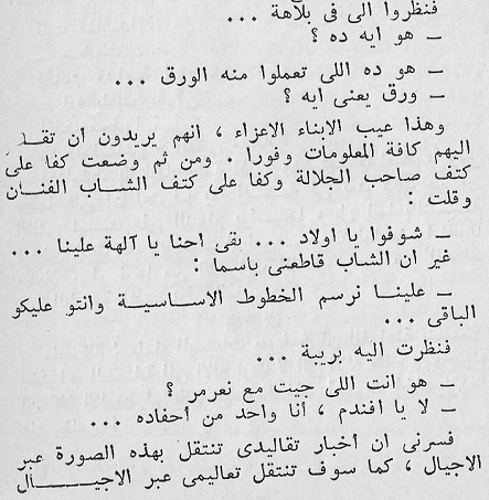 (وذات يوم أقبلت حتشبسوت لتتفرج على العمل _ مسرورة بالطبع _ ثم لحق بها الغلام تحتمس الذي أصبح في العاشرة من عمره. قالت له حتشبسوت بنوع من السرور: - شايف الصورة الحلوة دي يا توتي؟ فاحتقن وجه الغلام وتطاير الشرر من عينيه: - قلت لك ألف مرة أنا موش توتي! أ��ا تحتمس الثالث ... فاهمة؟ فضحكت حتشبسوت وقال: - معلهش يا صاحب الجلالة .. ومدت يدها لتداعب شعره فدفعها وابتعد وهو يبرطم. وهذا عيب أطفالنا _ نحن الفراعنة _ أنهم يكبرون أسرع من اللازم، وفيما يشبه غمضة عين رأيت أمامي فتى يقترب من العشرين، قصيرًا عريض الكتفين مدكوك العضلات، غاضبًا أشد الغضب وقد عرف أن حتشبسوت سوف ترسل إلى بلاد بونت اسطولًا مصريًا في بعثة سلمية. - سلمية عشان إيه؟ (هكذا صاح) .. ليه متكونش حربية؟ فرمقته حتشبسوت في برود وقالت: - وليه ما تكونش سلمية؟ - وليه متكونش حربية؟ فردت عمته وهي تحاول المحافظة على هدوئها: - وليه متكونش سلمية؟ - عشان لازم نحارب .. لازم نوري الدنيا قوتنا! - الدنيا عارفة قوتنا كويس، والبركة في جدك تحتمس الأول. - وليه منعملش زي جدي؟ ليه منفتحش آسيا؟ - ونفتحها ليه؟ - علشان تبقى بتاعتنا ... - تحب حد يفتح مصر؟ - لا طبعًا ... - طب ليه نفتح آسيا؟ - دة سؤال حريمي! البلد دي موش نافعة طول ماحاكمها حرمة! وهنا نفد صبر حتشبسوت ..)