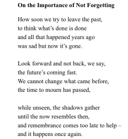 27 January, Holocaust Remembrance Day. In three short stanzas, “On the Importance of Not Forgetting” demonstrates the need to look forward as well as back.
