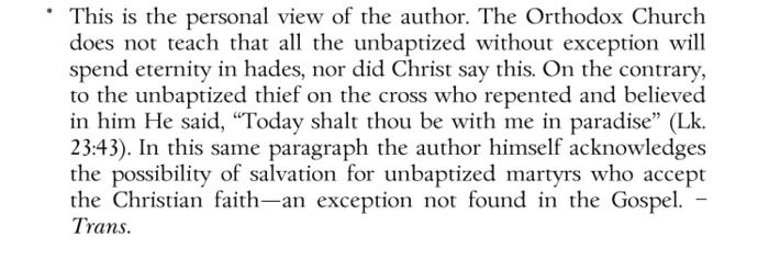 In this footnote on page 18, Fr. Nathan directly rebuts St. Daniel and inserts his own opinion as that of "The Orthodox Church." He also directly contradicts his own detraction by acknowledging St. Daniel's acknowledgment of an exception. St. Dismas was also baptized by Christ's blood after St. Longinus pierced His side, and martyrs are baptized by their own blood.