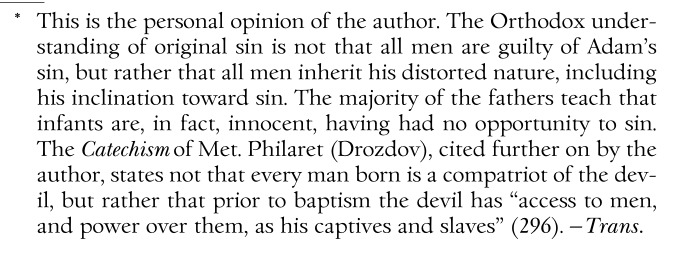 This is complete nonsense, and contradicted directly by St. Philaret's catechism that he himself quotes in the footnote! Using St. Philaret to argue that the unbaptized "aren't compatriots of the devil, just his captives and slaves" is self-contradictory and ridiculous. If you deny original sin, then they'd have to be "compatriots" (willing accomplices) rather than "slaves" (unwilling). This is completely incoherent, in addition to immensely disrespectful to both Orthodoxy itself and St. Daniel, who wrote against modernists like Fr. Nathan! Why did he translate St. Daniel's work if he despises his theology so? It's very strange.