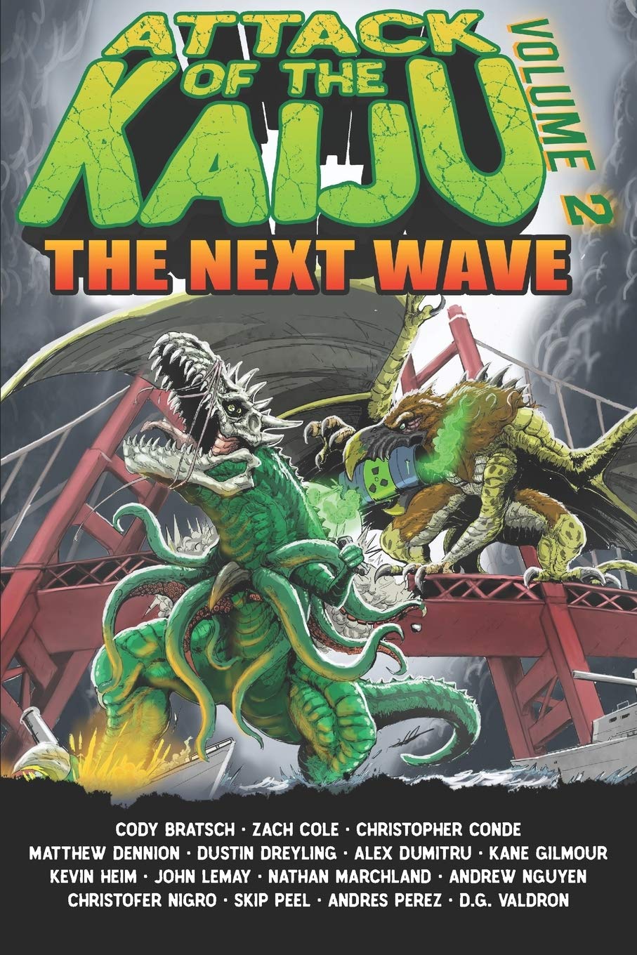If you ever had nightmares about your entire city being destroyed by gigantic, nigh-indestructible monsters – or daikaiju, as we like to call them in Japanese fashion – then ATTACK OF THE KAIJU Volume 2: THE NEXT WAVE is most definitely for you. Better yet, if you ever fantasized about actually *being* the kaiju that did the city smashing, then this anthology also has your name on it. Or, if you instead fantasized about being a gigantic super-hero or the pilot of an enormous kaiju-busting robot – well, your dreams will find good representation here too! This second installment in the ongoing ATTACK OF THE KAIJU series has thirteen tales of giant monster mayhem brought to you by fourteen different authors, as well as three bonus essays by additional writers covering the world of kaiju. This includes such prominent kaiju authors as Matthew Dennion (publisher of ATTACK OF THE KAIJU Volume 1: AGE OF MONSTERS and creator of the series, SCOURGE OF THE GODS, and ATOMIC REX); Skip Peel (long-time scribe of kaiju fiction for G-FAN magazine); Zach Cole (creator of Marugrah, whose published saga began with KAIJU EPOCH); and Andres Perez (co-host of the popular KaijuNoir channel on YouTube and creator of the kaiju-fighting mech warrior Draco Azul, now in his own comic book). Also included is the work of Kane Gilmour, John LeMay, Christofer Nigro, D.G. Valdron, Christopher Conde, Alex Dumitru, Neil Reibe, Cody Bratsch, Andrew Nguyen, Nathan Marchland, Kevin Heim, and Dustin Dreyling. Within these pages humanity desperately tries to fight their way back to the top spot as ruler of the world, but can their paltry military weaponry hope to prevail against the most powerful monsters in the genre of fantastic fiction? And where common soldiers may come up short, could super-heroic sentai and robotic mechs – both of whom can match the kaiju in size and power – possibly help turn the tide in favor of human civilization? Can even the gods themselves help preserve humanity’s reign, or are the titanic predators destined to transform their respective Earths into a kaiju kingdom?The answers to these questions will be found in this very tome, so read if you dare! A lot of great excitement and horrifying nightmares await you inside.