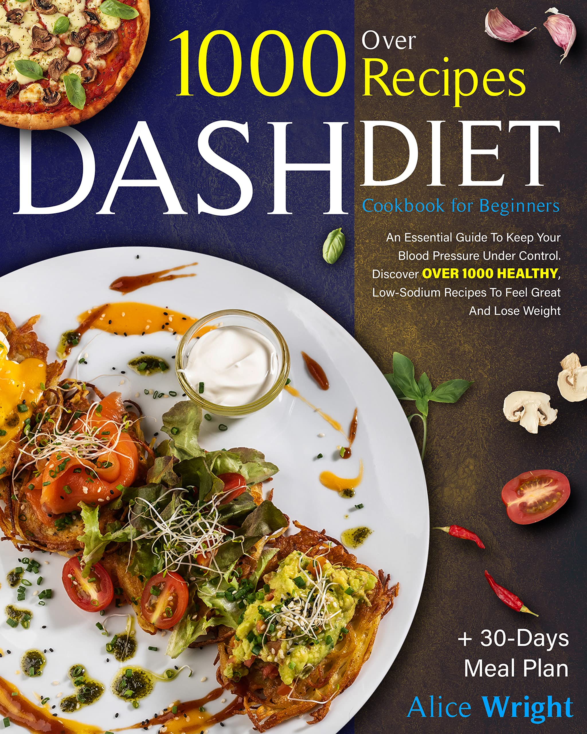 DASH DIET COOKBOOK FOR BEGINNERS : An Essential Guide to Keep Your Blood Pressure Under Control. Discover Over 1000 Healthy, Low-Sodium Recipes to Feel Great and Lose Weight + 30-Days Meal Plan by Alice Wright This book starts out with table of contents where recipes are listed as meals and food categories. Introduction discusses the diet itself, foods to avoid and foods allowed along with servings per day and those to avoid. Benefits and tips to succeed are included. 21 day meal plans. Each recipe starts with a title, prep and cook times and servings. List of ingredients and you should be able to substitute for your healthier dietary needs: low fat, low sodium, low sugar and fresh vs canned items. Some contain a LOT, be sure to have them all first. Directions are given and some nutritional information: calories, fat, carbs, protein, cholesterol, sodium, potassium are listed, NOT sure of serving size. One recipe wants you to place sheet in preheated oven, but never tells you the temperature. Read recipe all the way through. Very few recipe pictures. Some recipes nutritional information only has calories, fat, carbs and protein listed, hmmm