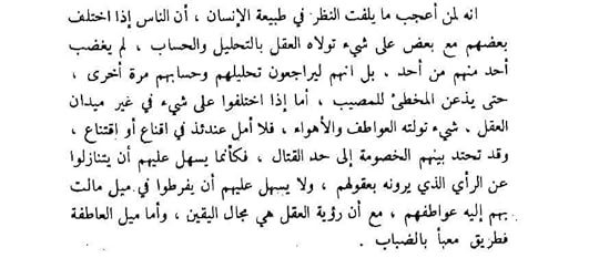سلاسة رائعة في اسلوب الكتابة، ثيمة واضحة تجمع المقالات المنفصلة المتصلة التي اشتمل عليها الكتاب، لا يعرض أفكار كثيرة، ولا يطمح الكاتب بأن يفعل، يهدف للاشارة نحو عوار منهج التفكير العربي وخطورة التفكير بالوجدان. أربع نجوم ونصف. يستحق القراءة والتوصية حتمًا