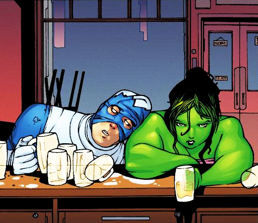In the first issue, Jen is enjoying her live in the Avengers mansion: wild parties, sleeping with an underwear model, and hurrying out of the court room when an Avengers mission calls for it. But her life is turned upside down: Cap and the Wasp tell her that she must move out of the mansion because the underwear model is a security risk, the model dumps her, and she’s fired from the law firm.