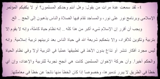 الوصول إلى تطبيق النظام الإسلامى ليس هدفًا عاجلًأ، لأنه لا يمكن تحقيقه إلا بعد نقل المجتمعات ذاتها،إلى فهم صحيح للعقيدة الإسلامية ثم للنظام الإسلامى، وإلى تربية إسلامية صحيحة على الخلق الإسلامي، مهما اقتضى ذلك من الزمن الطويل والمراحل البطيئة