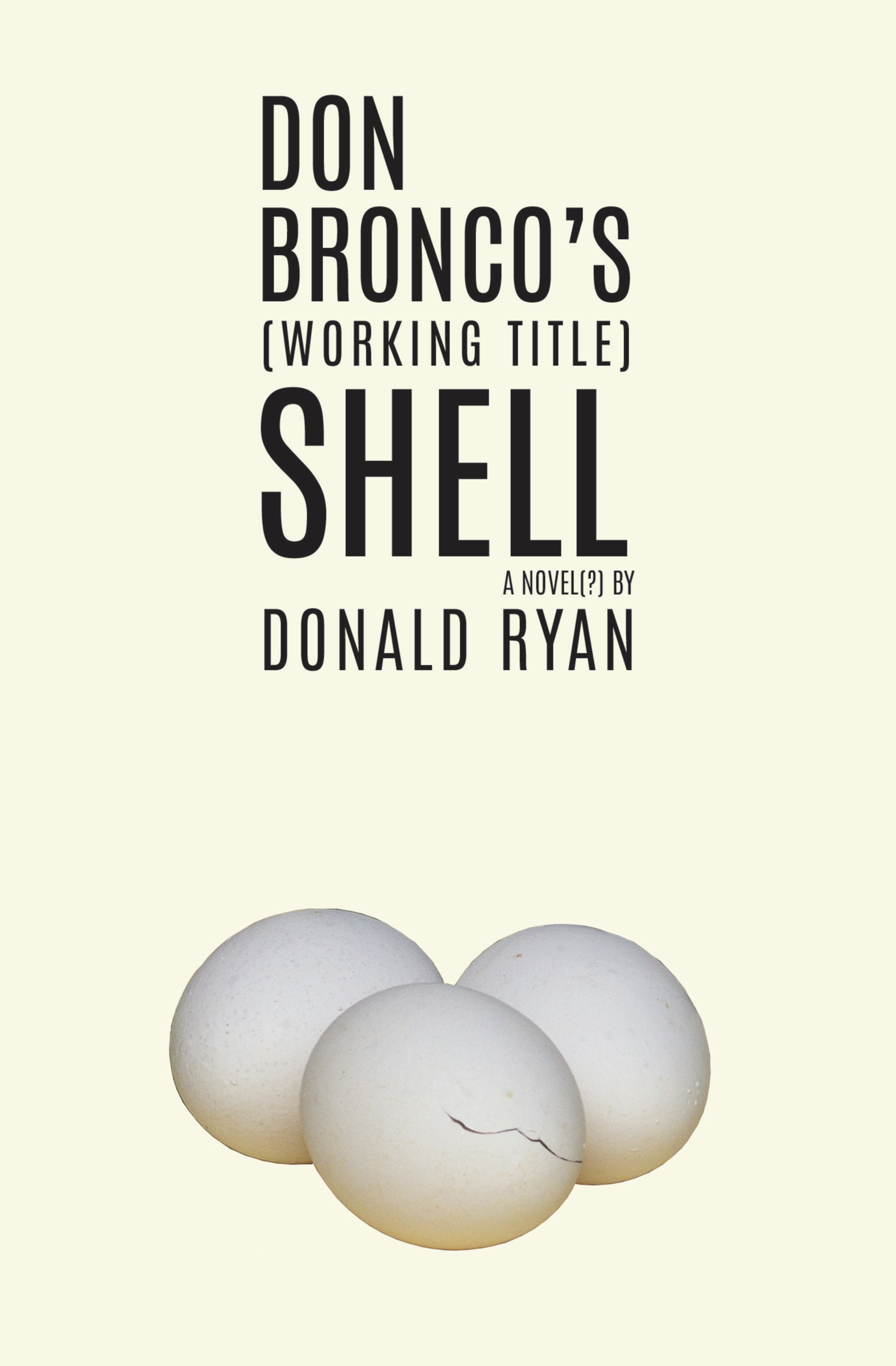 The stilted construction of the title and subtitle of this novel(?) reeled me in, and every time I frantically gave my girlfriend a run down of the plot a la Charlie Kelly’s “Pepe Silvia” rant, I felt the need to address the novel by its full front cover text. Don Bronco’s (Working Title) Shell: A Novel(?) by Donald Ryan. The use of parentheses and the inclusion of the Two Dons aptly reflect the contents.