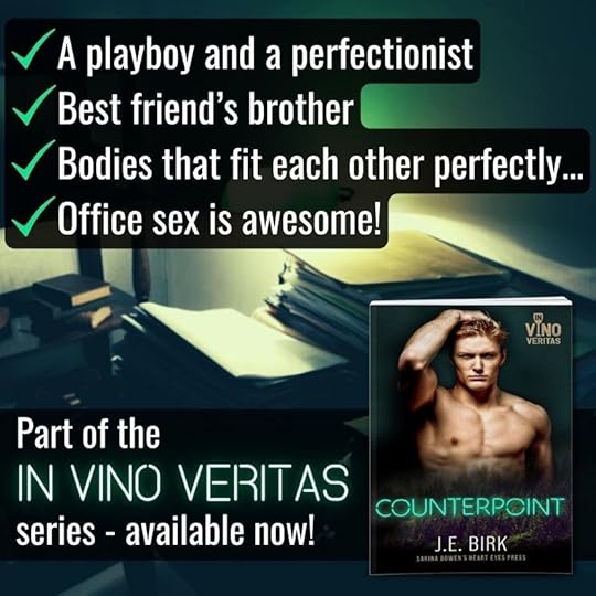 Sometimes two wrongs do make a right.  At least they do in J.E. Birk’s Counterpoint, the second book in the In Vino & Veritas series.  Vino & Veritas, the titular fictional, inclusive bookstore/wine bar located in Burlington, Vermont, set in Sarina Bowen’s True North world, has already been the subject of an extensive multi-author, shared universe series, Vino & Veritas.  This spin-off series, In Vino Veritas, continues with the love stories of some of the side characters we met in the first V&V series.