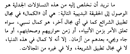 ثم يبدأ بالتدليل على فكرة فتح باب الاجتهاد -لأهله طبعاً - "القرآن تحدث مراراً وبوضوح عن الأمة ولكنه تجنب الحديث عن النظام السياسي الاجتماعي الاقتصادي الذي بات يجسد تلك الأمة في دولة، وترك المسألة للمسلمين وكأنها داخلة في قوله عليه السلام: (أنتم أدرى بشؤون دنياكم) . "
