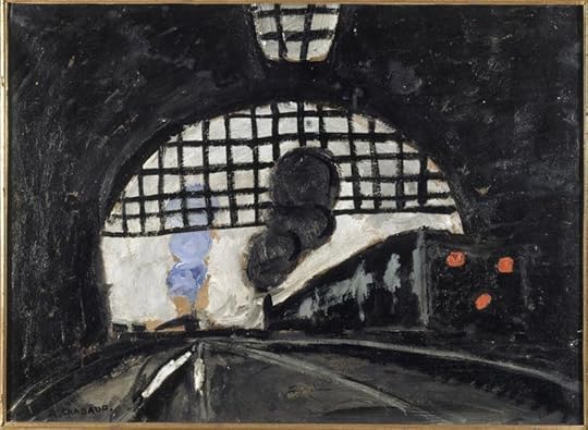 'Jacques fuyait dans la nuit mélancolique. Il monta au galop le sentier d’une côte, retomba au fond d’un étroit vallon. Des cailloux roulant sous ses pas l’effrayèrent, il se lança à gauche parmi des broussailles, fit un crochet qui le ramena à droite, sur un plateau vide. Brusquement, il dévala, il buta contre la haie du chemin de fer : un train arrivait, grondant, flambant ; et il ne comprit pas d’abord, terrifié. Ah ! oui, tout ce monde qui passait, le continuel flot, tandis que lui agonisait là ! Il repartit, grimpa, descendit encore. Toujours maintenant il rencontrait la voie, au fond de tranchées profondes qui creusaient des abîmes, sur des remblais qui fermaient l’horizon de barricades géantes. Ce pays désert, coupé de monticules, était comme un labyrinthe sans issue, où tournait sa folie, dans la morne désolation des terrains incultes. Et, depuis de longues minutes, il battait les pentes, lorsqu’il aperçut devant lui l’ouverture ronde, la gueule noire du tunnel. Un train montant s’y engouffrait, hurlant et sifflant, laissant, disparu, bu par la terre, une longue secousse dont le sol tremblait.'