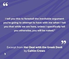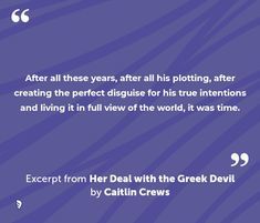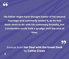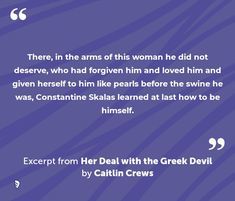 Caitlin Crews solidifies the latter point by writing a fabulous epilogue, set 10 years in the future, that allows me to see that the new and improved Constantine ( the domesticated faithful husband and father of 4 ), is here to stay.