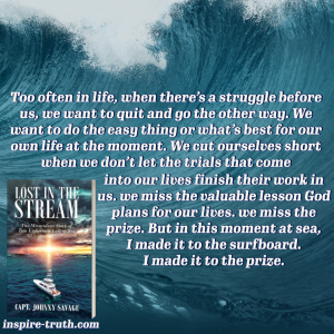 "Too often in life, when there’s a struggle before us, we want to quit and go the other way. We want to do the easy thing or what’s best for our own life at the moment. We cut ourselves short when we don’t let the trials that come into our lives finish their work in us. we miss the valuable lesson God plans for our lives. we miss the prize. But in this moment at sea, I made it to the surfboard. I made it to the prize." ~ Captain Johhny Savage