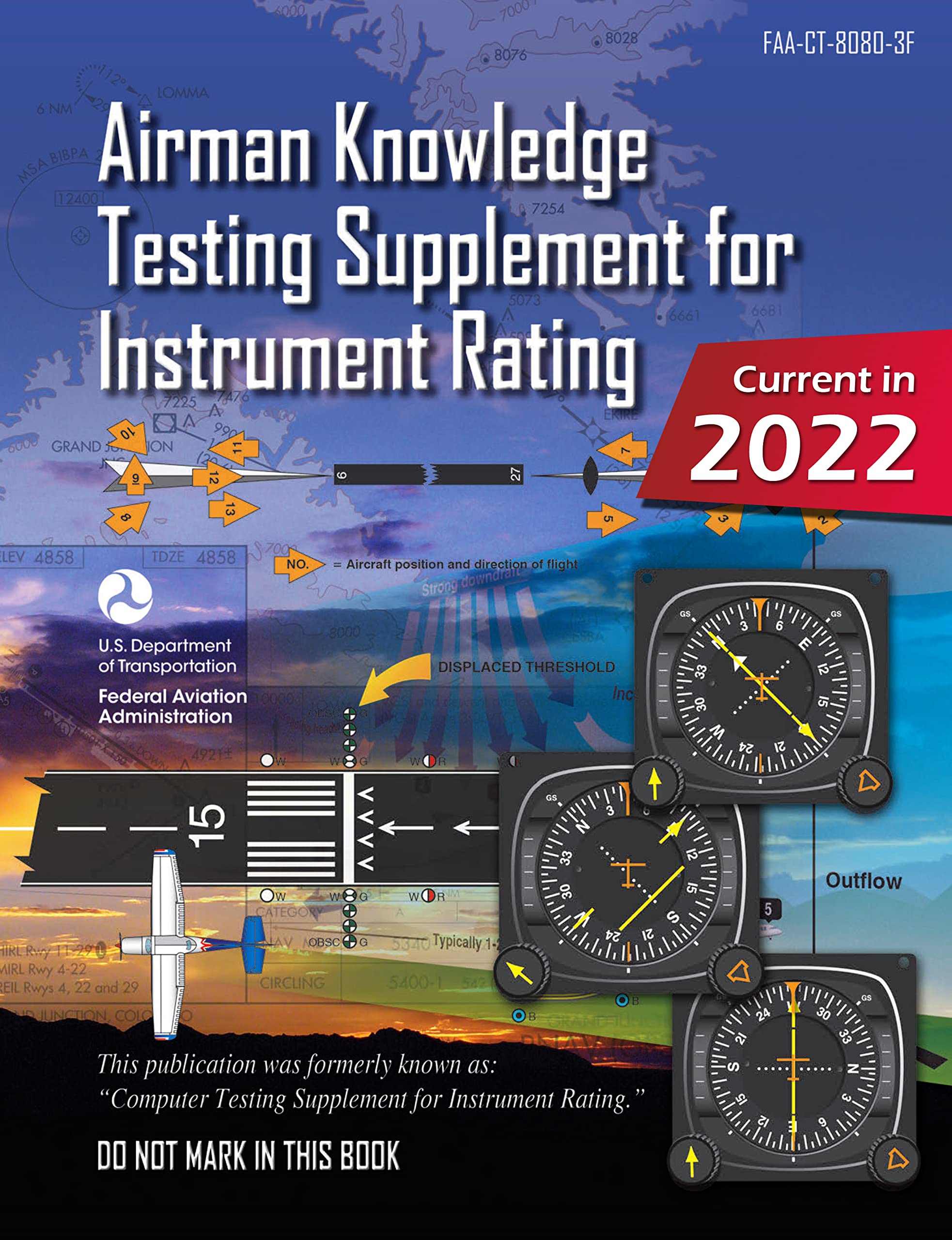 FAA Airman Knowledge Testing Supplement for Instrument Rating FAA-CT-8080-3F. Released in 2017, for use in 2024.This is the exact same book you will get during your FAA Knowledge Exam. Make sure you are familiar with it and know how to quickly lookup charts, tables, and diagrams! This Airman Knowledge Testing Supplement is designed by the Federal Aviation Administration (FAA) Flight Standards Service. It is intended for use by Airman Knowledge Testing (AKT) Organization Designation Authorization (ODA) Holders and other entities approved and/or authorized to administer airman knowledge tests on behalf of the FAA in the following knowledge Rating—Airplane (IRA)Instrument Rating—Rotorcraft/Helicopter (IRH)Instrument Rating—Powered Lift (IPL)Instrument Flight Instructor—Powered Lift (IPI)Instrument Rating—Foreign Pilot (IFP)Instrument Flight Instructor—Airplane (FII)Instrument Flight Instructor—Rotorcraft/Helicopter - (FIH)Instrument Flight Instructor—Airplane (added rating) (AIF)Instrument Flight Instructor—Rotorcraft/Helicopter (added rating) (HIF)Ground Instructor—Instrument (IGI)