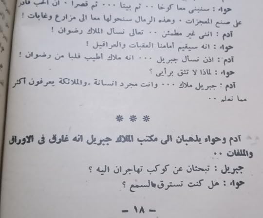 فتجد علي أمين بجراءة يصف جبريل على أنه عامل مكتبي كموظف حكومي غارق في أوراقه وملفاته التي لا نهاية لها قابع يسترق السمع للزائران ادم وحواء في الجنة .. انا اشهد ان هذا العمل لو كان مشهور زيادة كان تم تكفيره، امر مضحك وساخر الحقيقة هههههههه