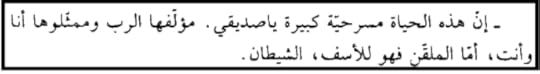 * ملحوظة: استمتعت بقراءة هذه الرواية مع صديقي (محمد فوزي) الذي رشحها لي، وبدأنا فيها سويًا. لا أستطيع شكره بالقدر الكافي - على الترشيح أولاً، وعلى نقاشاتنا الممتعة حولها ثانيةً. انا قارئة نهمة وسريعة، بينما هو يقرأ بتأنٍ ويقوم بصنع مذكرات وشروح صغيرة مما يجعل المنافسة معه عسيرة. استمتعت بهذه التجربة الفريدة، وأتمنى ألا تكون الأخيرة. * مقتطفات: