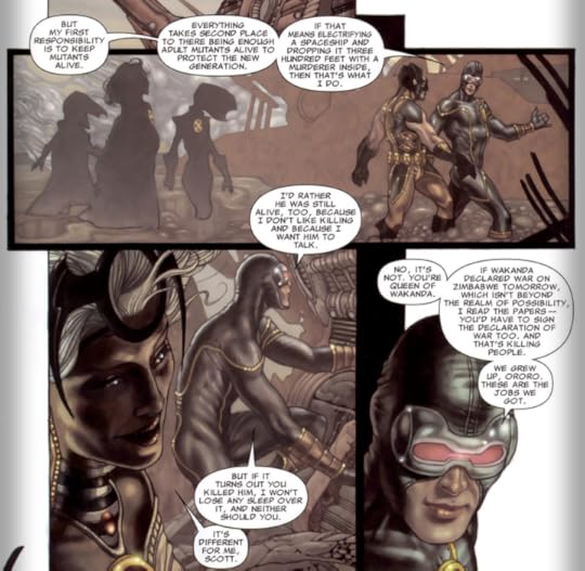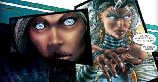 Now, let's talk about the art. The first time I saw it, I was actually quite impressed. Very detailed. But the further I got in the book, the more those details becomes confusing, muddying the point of the panels. More is not always more, even when it comes to details. This isn't even touching on what I thought of the artist's design for Storm, but let's touch on that. What was that thing? What experienced superhero would wear something like that to save the world in? Especially when she's also a queen? Can somebody tell me what is so wrong with a female superhero wearing a costume that's not entirely nonsensical for fighting crime?
