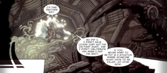I also had a problem with the action sequences. This is a big point as to why my rating is so low. I know from the dialogue and the points leading up that yes, there were fights and battle scenes. But I just couldn't SEE it. And this really bothered me. I don't read X-Men for their witty dialogue alone. I need and crave their action and the BAM! KICK! KAPOW! (though they are much more clever than I am). I just wanted more, especially after the amazing things Cassaday did with these characters. But that time, sadly, is gone.