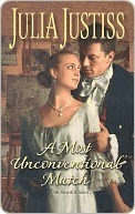 Well, I really liked this book. While I sometimes consider books a way of escaping the real world, I think sometimes we are bombarded with stories which stretch credibility just because authors think they must do that to make the story “fresh.” While I occasionally may read a book which is silly or nonsensical and the actions of the characters are way over the top, I also love reading romances which can take normal everyday life and create something unique. It takes a special writer to take the mundane and turn it into something engaging. That’s what we have here in Julia Justiss’ A Most Unconventional Match - 2008.