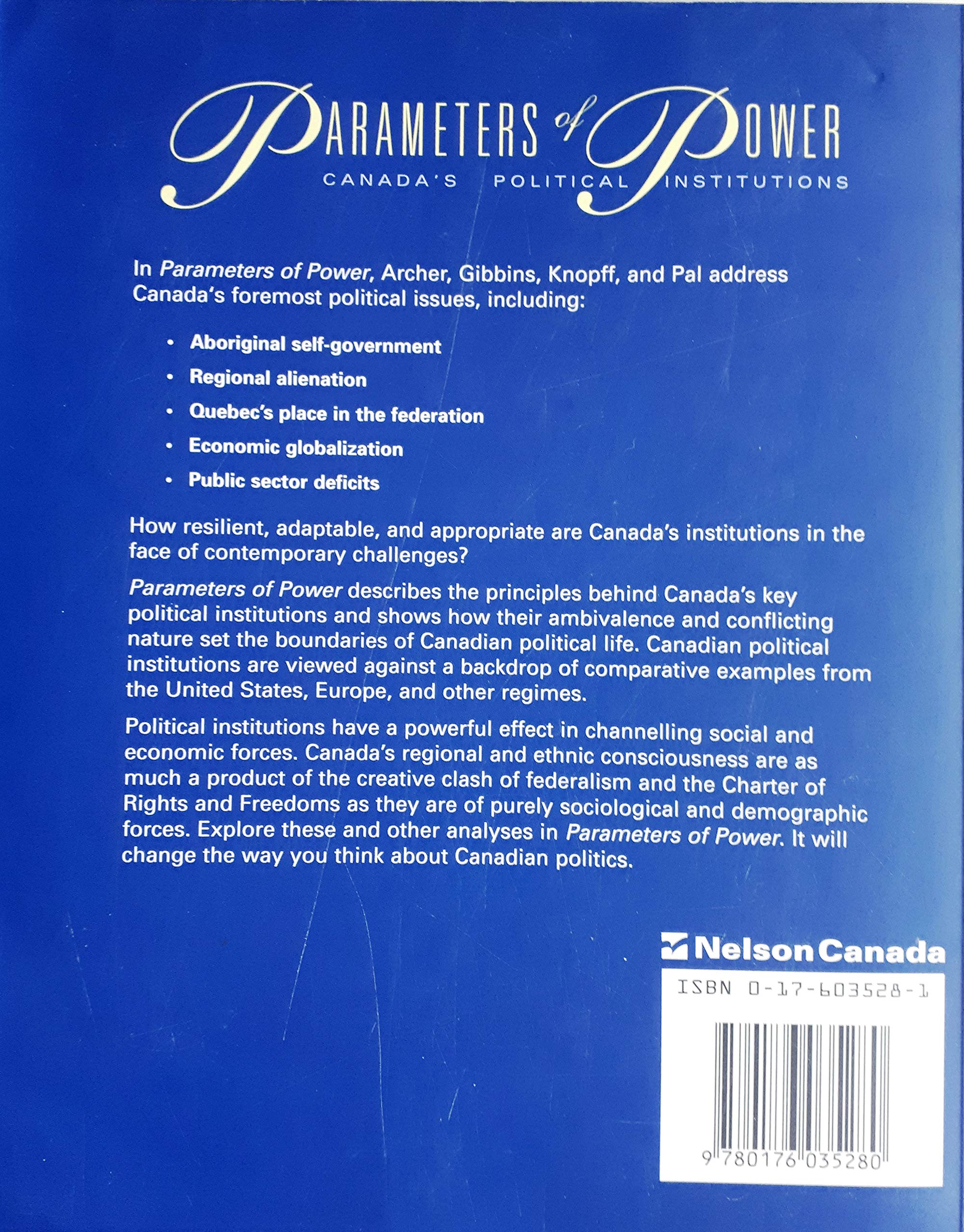 Streamlined and rewritten to meet the needs of the market, Parameters of Power now fits the one-term Canadian Politics course much better, and is more balanced than ever before! The defining questions of modern Canadian politics are about institutions and the ways in which they shape our political life. Capturing the underlying logic of federalism, the Charter of Rights, electoral systems and many other areas, Parameters of Power tries to make sense of issues as they move dynamically from one institutional arena to the next. By giving social and cultural factors greater prominence, the third edition recognizes Canada's social diversity and inequalities much more so than any competing text.