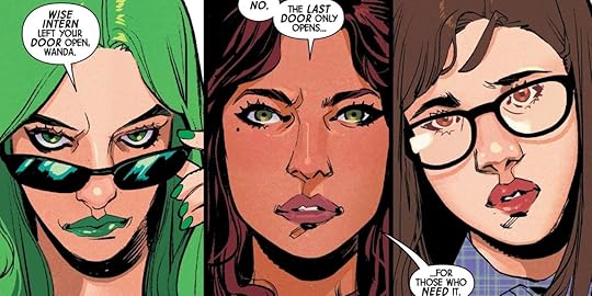 Some of this worked for me, there's good potential. The Last Door is a familiar concept and I like it, even though it's mostly a mechanism for disjointed single-issue adventures. Wanda and Pietro finally have the right skin tone, and Sarah Picelli's art is nice, especially Wanda's design (though I don't like her pouty faces), but not the sole reason to read the book.
