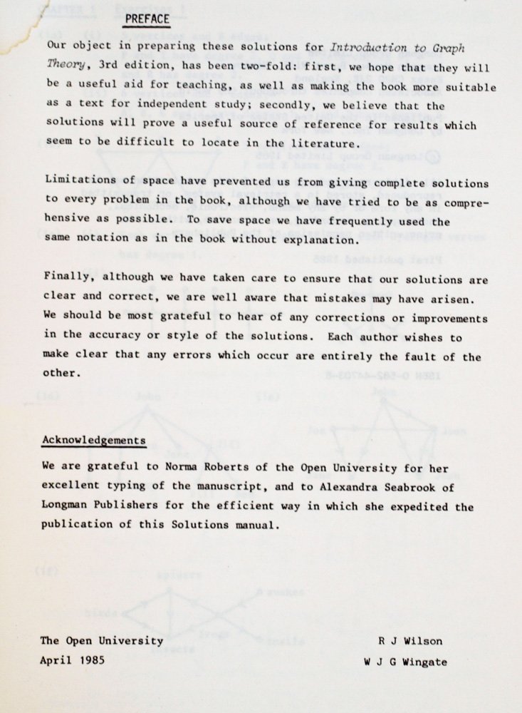 The opening chapters provide a basic foundation course, containing such topics as trees, algorithms, Eulerian and Hamiltonian graphs, planar graphs and colouring, with special reference to the four-colour theorem. Following these, there are two chapters on directed graphs and transversal theory, relating these areas to such subjects as Markov chains and network flows. Finally, there is a chapter on matroid theory, which is used to consolidate some of the material from earlier chapters.